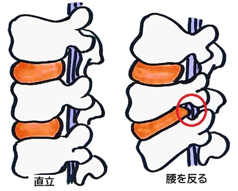 脊柱管狭窄症は、身体を反ると神経の通り道が狭くなり(赤丸)足が痛くなる